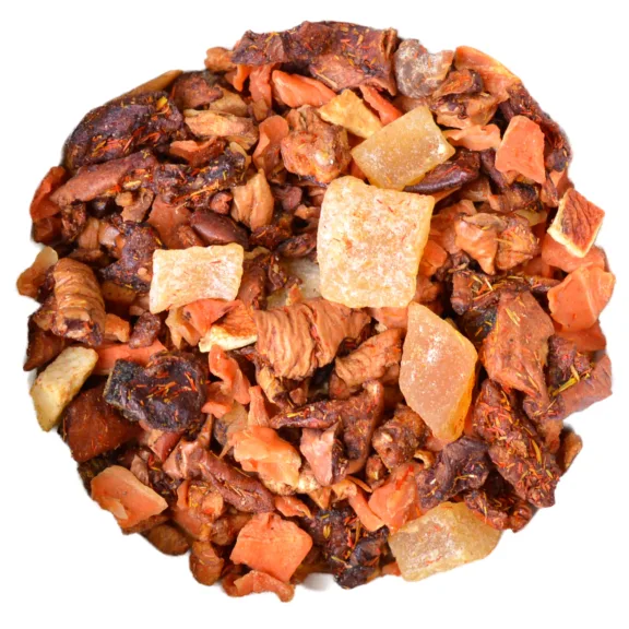 Karkadè fiori, Rosa canina frutto, Arancio dolce scorze, Papaya frutto, Pesca 3%, Albicocca 3%, aromi.