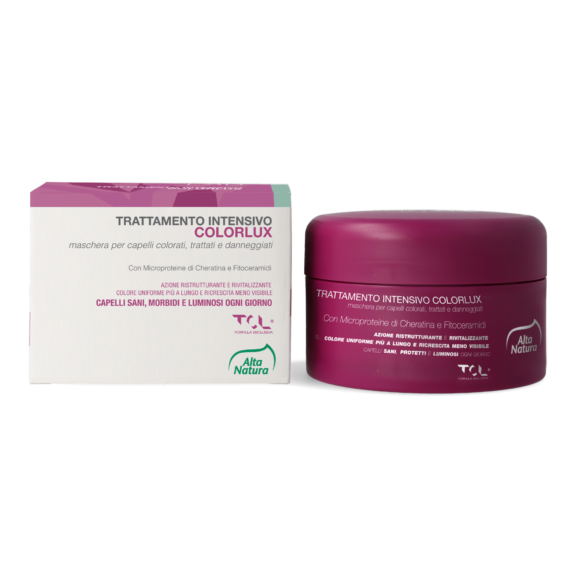 Il trattamento intensivo Colorlux ristruttura e rivitalizza il capello, grazie ai coco-gliceridi contenuti nel burro di mango selvatico bio, dona volume e luminosità alla chioma. L’efficace combinazione di TCL con le microproteine idrolizzate di cheratina, consente il quotidiano nutrimento del capello sottoposto a cicli di trattamenti di colorazione.